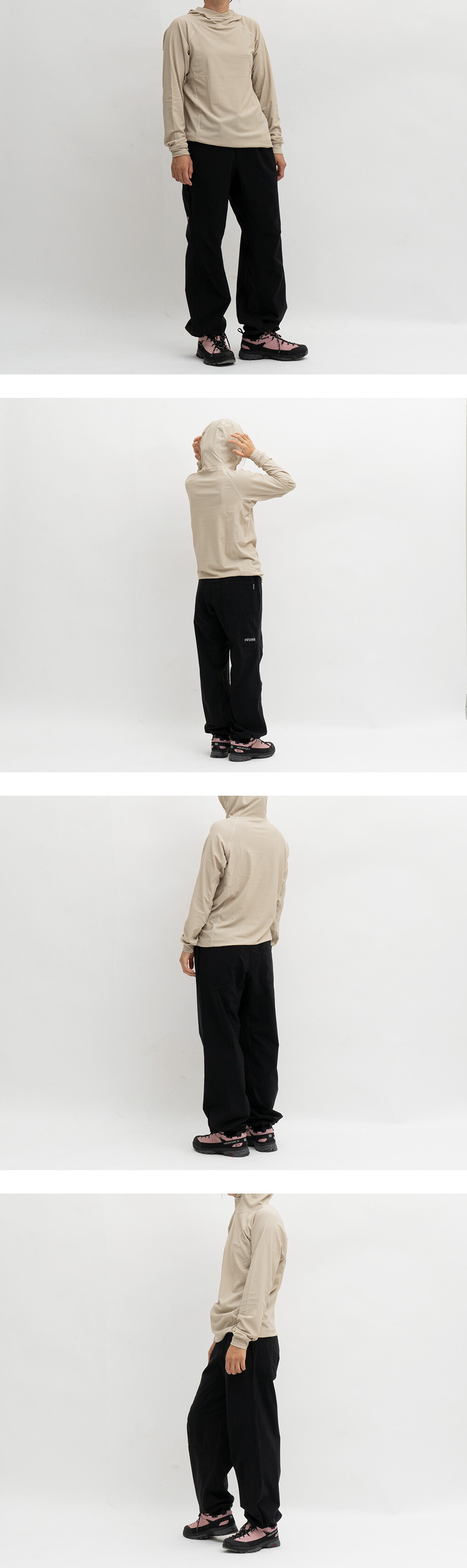 10부 기장의 스트레이트 핏이며, 밑단 스트링을 조절하여 조거스타일로도 연출 가능합니다.