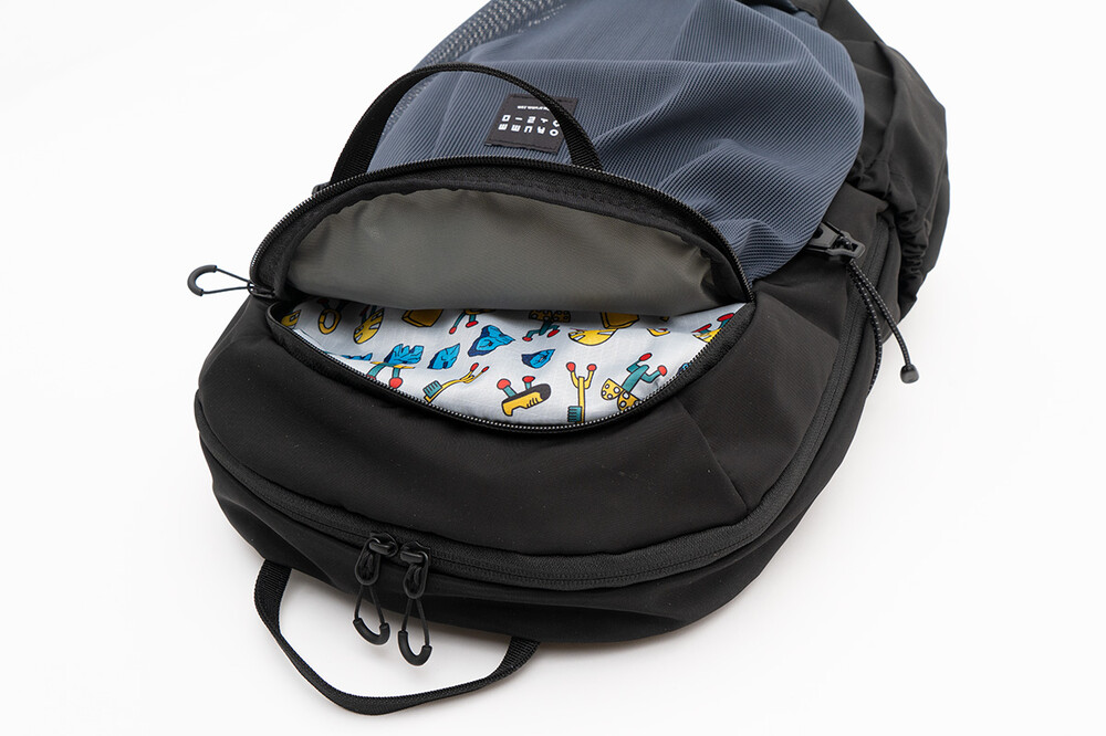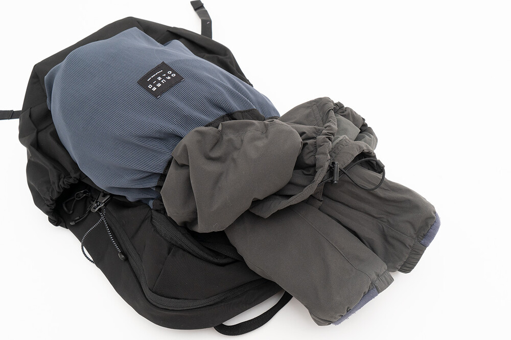 앞 메쉬 주머니 부분은 원단 분량이 넉넉하고 신축성이 있어, 클라이밍헬멧이나 자켓 등 부피있는 물건들을 수납하기 좋습니다.