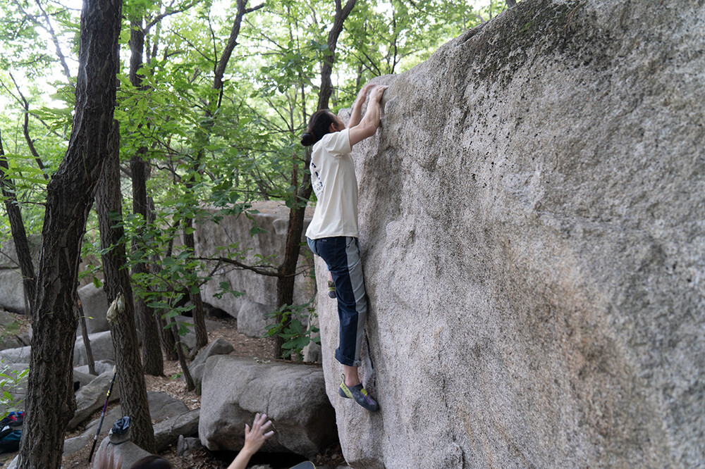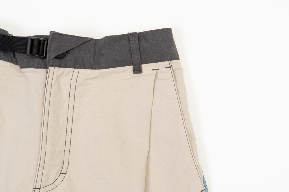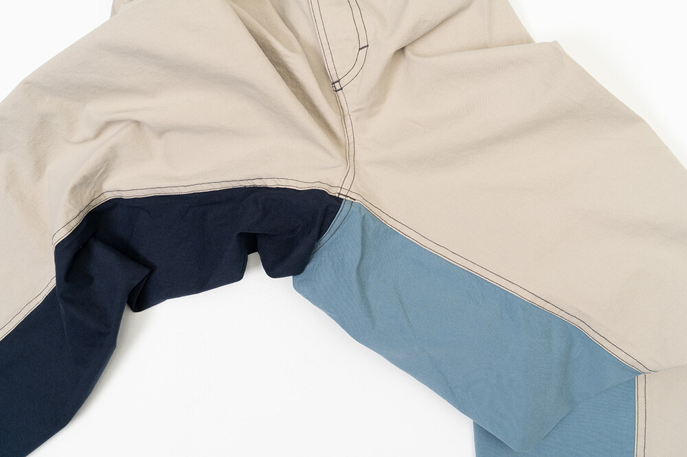 거싯(gusset)이 없는 바지입니다. 가랑이 부분에 시접이 두껍게 몰리는것을 방지하기 위해 위 사진과 같이 앞 중심선이 교차하여 맞물리지 않게 패턴을 적용하였고, 튼튼한 바텍 봉재를 추가하였습니다.